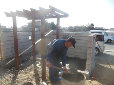 サンクンガーデンがどんどん形になってきました。脇にはパーゴラも立てています。