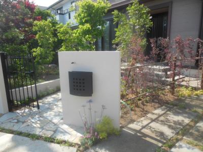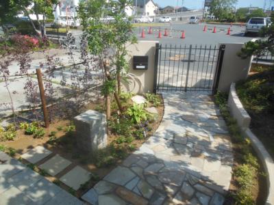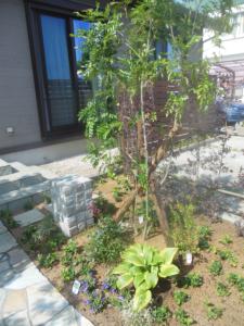 駐車場と玄関アプローチの間には、奥さまのご希望でベニバナトキワマンサクを植えました。まだ植えたばかりなので、わかりにくいですが、これから紅い葉がたくさん出てくるとまた印象がよくなっていきますね。