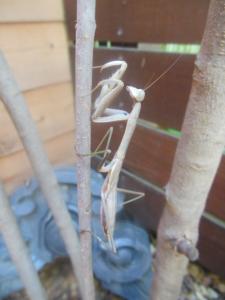 すると木の下のほうに・・・枝と間違えそうな大きめの茶色のカマキリ発見・・・(^u^)。カマキリは害虫を食べてくれるので、助かりますね。(I)