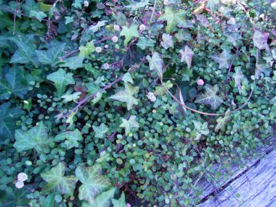 (写真はワイヤープランツとヘデラです。小さくて丸い葉がワイヤープランツです)