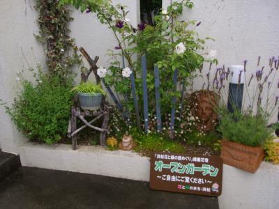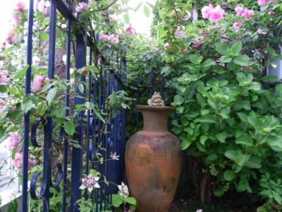 アイアンのフェンスとアンティークな壺、レンガが華やかなバラと相乗効果で味わいが出ていますね。