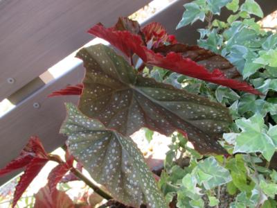 第二展示場のおしゃれな物置脇の花壇に、変わった葉色のベゴニアが。