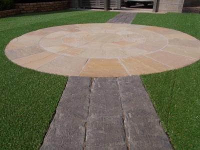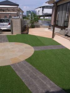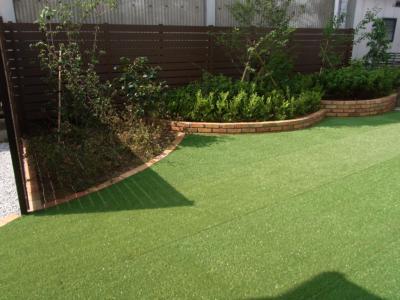 床は人工芝を張り、ポイントとしてサークルの自然石を設置してそれぞれの方向から、アプローチを作り庭への流れを作りました。植栽スペースもしっかりと確保して四季を感じられるようにプランをしました。