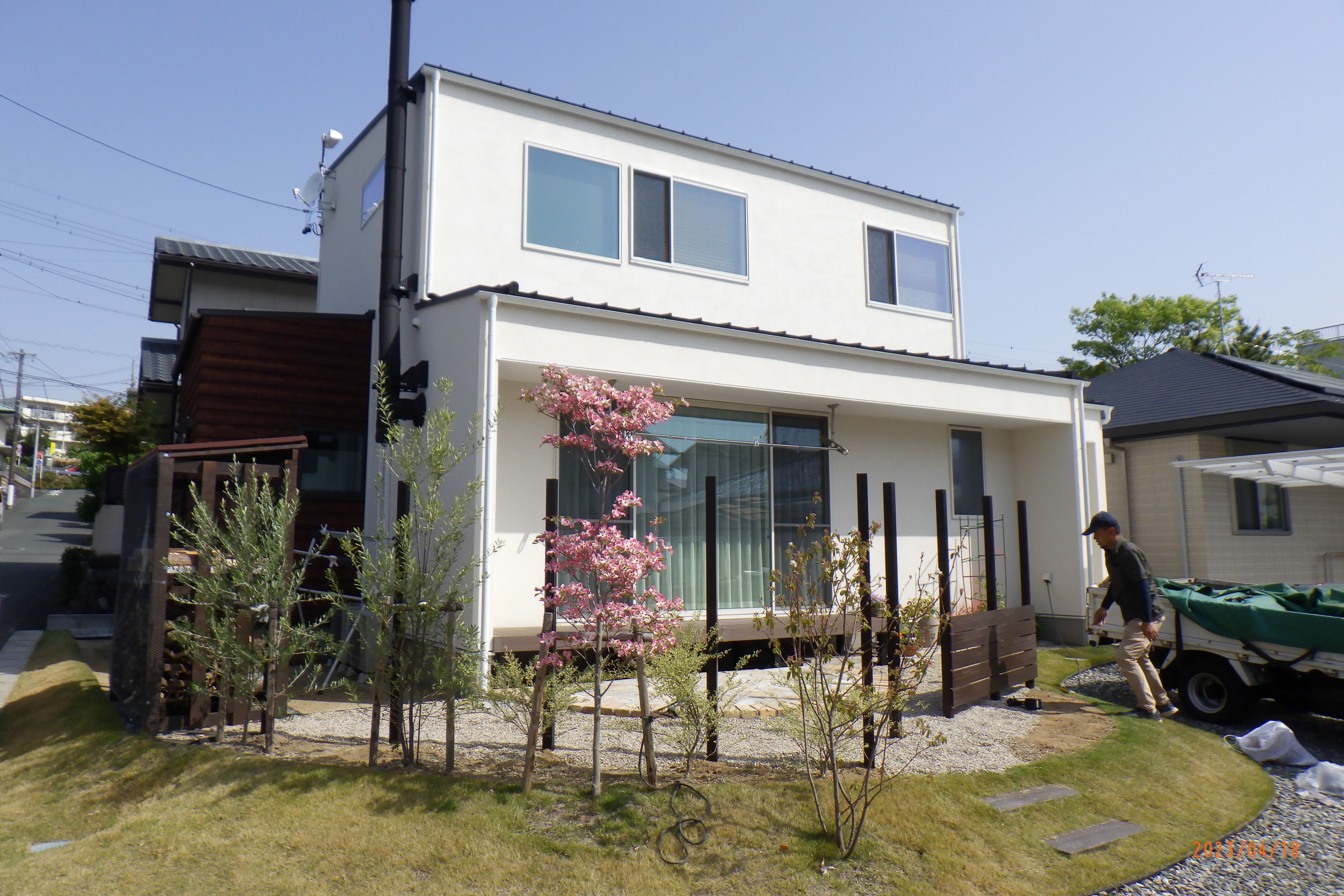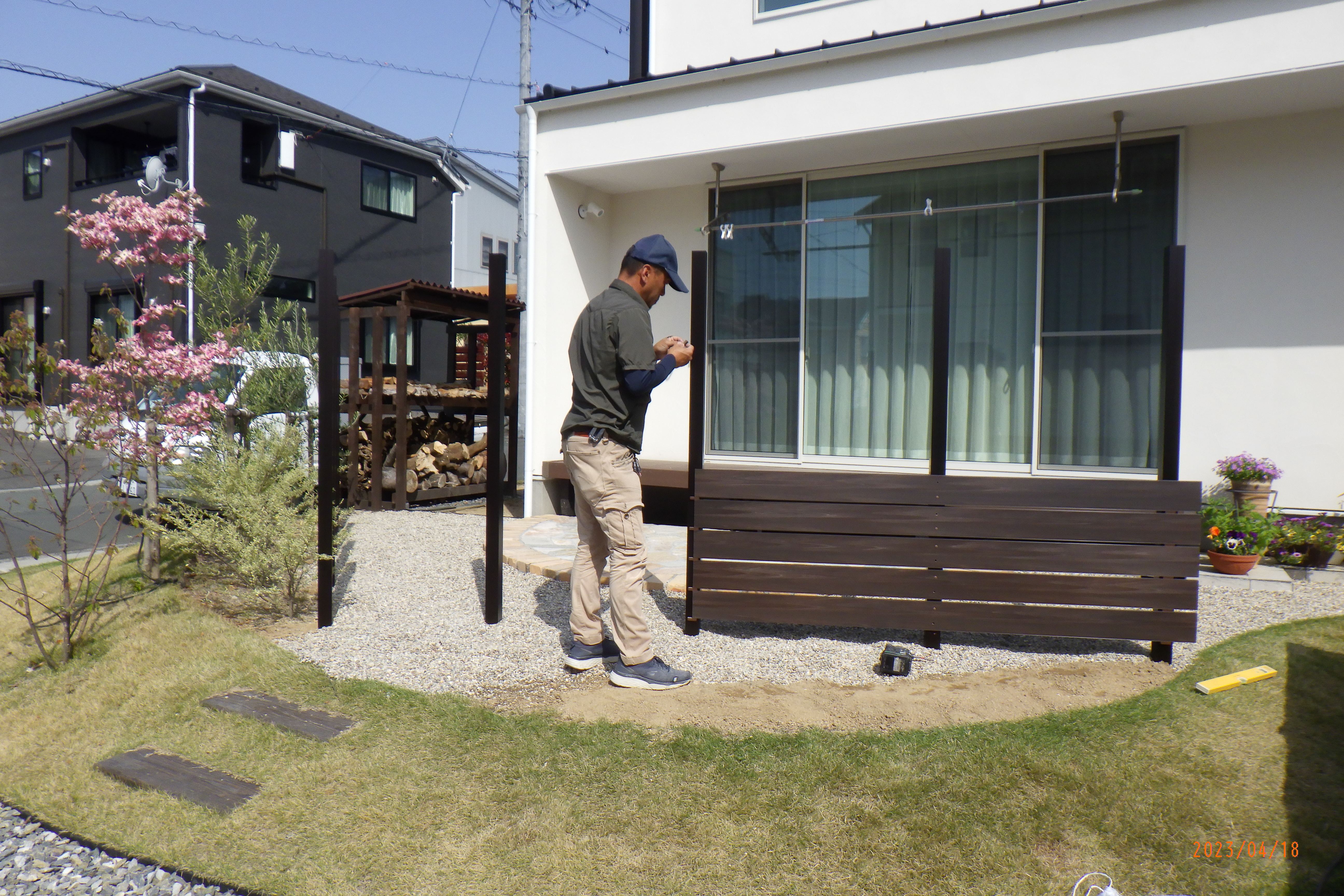 ご主人さんに歩いてもらい、板塀の取り付け